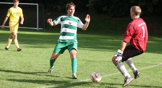 Der Roschützer Daniel Gehrt (Mitte) schiebt mutterseelenallein vor OTG-Torwart Philipp Ziegenbein den Ball zum 2:1-Siegtreffer ins Netz. Bis fünf Minuten vor Schluss hatte Gastgeber OTG noch das 1:1 verteidigt. (Foto: Jens Lohse)